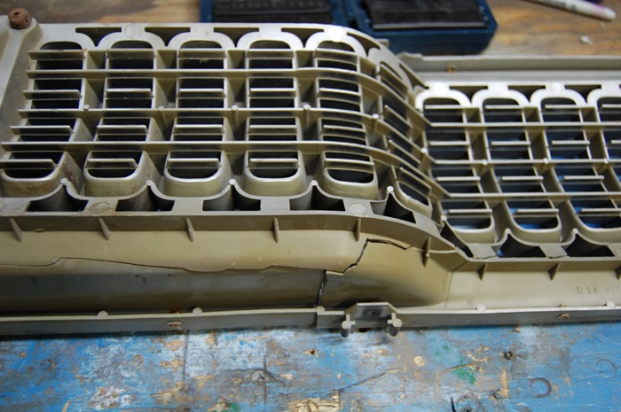 Shark-Tooth Grille RepairThe 340 cars and Duster Twisters came with a unique grille, commonly referred to as a "shark tooth" grille. Originals are rare, and I've heard mixed reviews of the reproduction by www.cudagrill.com (plus, they seem to have disappeared). I was able to get a "good deal" on a complete, but cracked, grille. I tried the "super glue and baking soda" fix, but it was too brittle and would crack under any real stress. I decided to order some "real" automotive plastic repair products. Here is the repair process. This crack was a problem because the grill did not want to stay together. Let go of it, and it would spring into the position you see here. That's why I didn't trust most adhesives to hold up over time. Turn signal lenses could have been better...